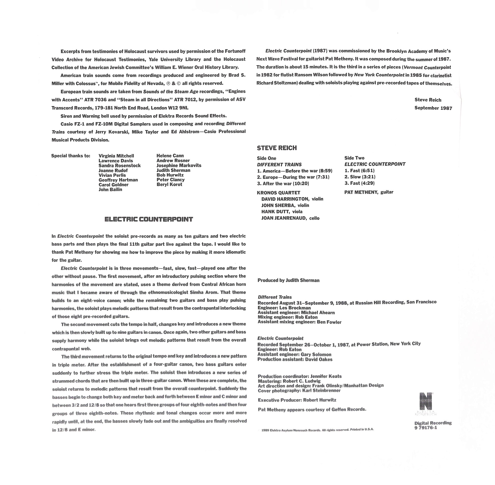 Steve Reich - Kronos Quartet / Pat Metheny - Different Trains / Electric Counterpoint