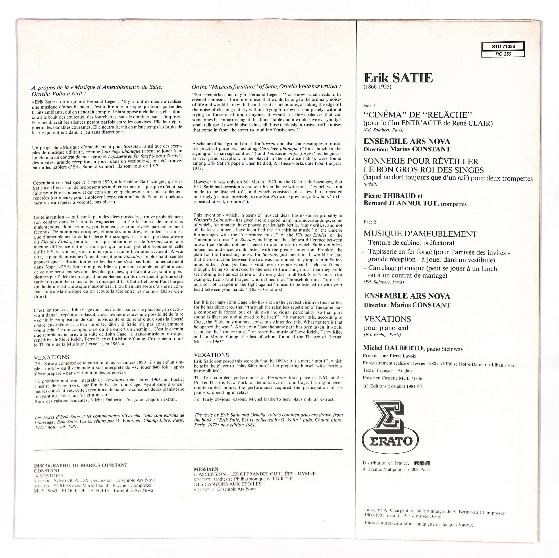Erik Satie / Ensemble Ars Nova - Entracte · Musique D'Ameublement · Sonnerie Pour Réveiller Le Roi Des Singes · Vexations