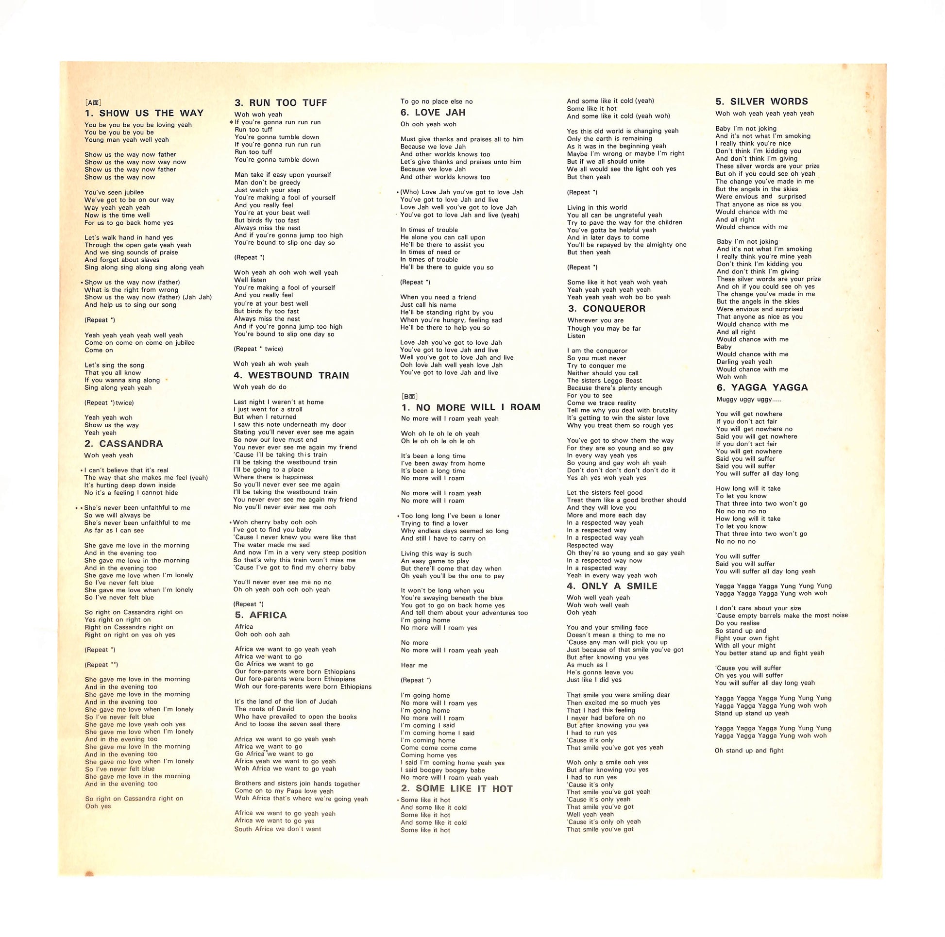 良品~並品。スレ、キズ、シミ、シワ、折れ、破れ、書込み、シール貼り(or 貼り跡)、テープ補修等、目立つ劣化や欠陥が認められる状態。程度に応じてVG+/VG/VG-の3段階に分けています。