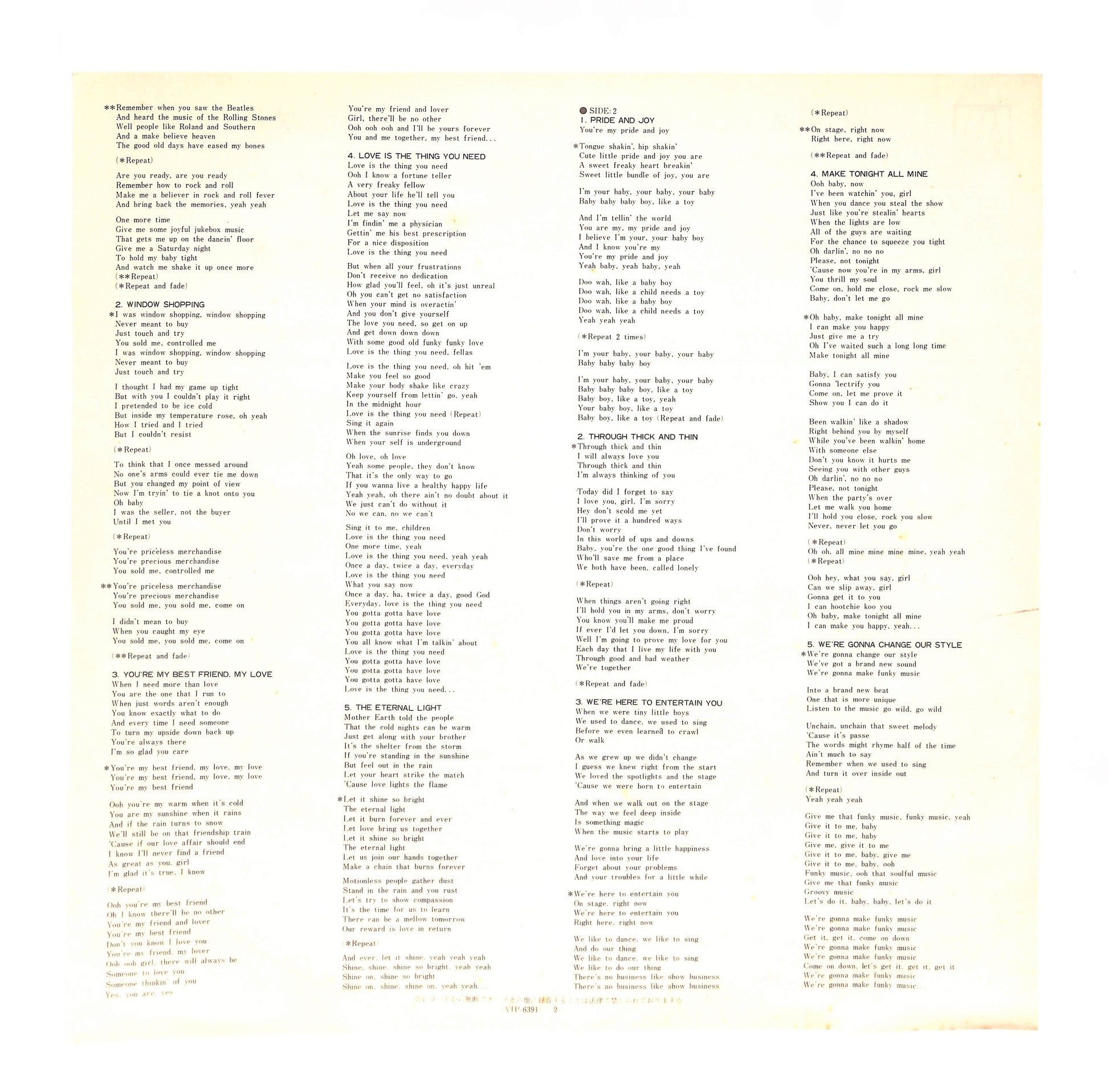 良品~並品。スレ、キズ、シミ、シワ、折れ、破れ、書込み、シール貼り(or 貼り跡)、テープ補修等、目立つ劣化や欠陥が認められる状態。程度に応じてVG+/VG/VG-の3段階に分けています。
