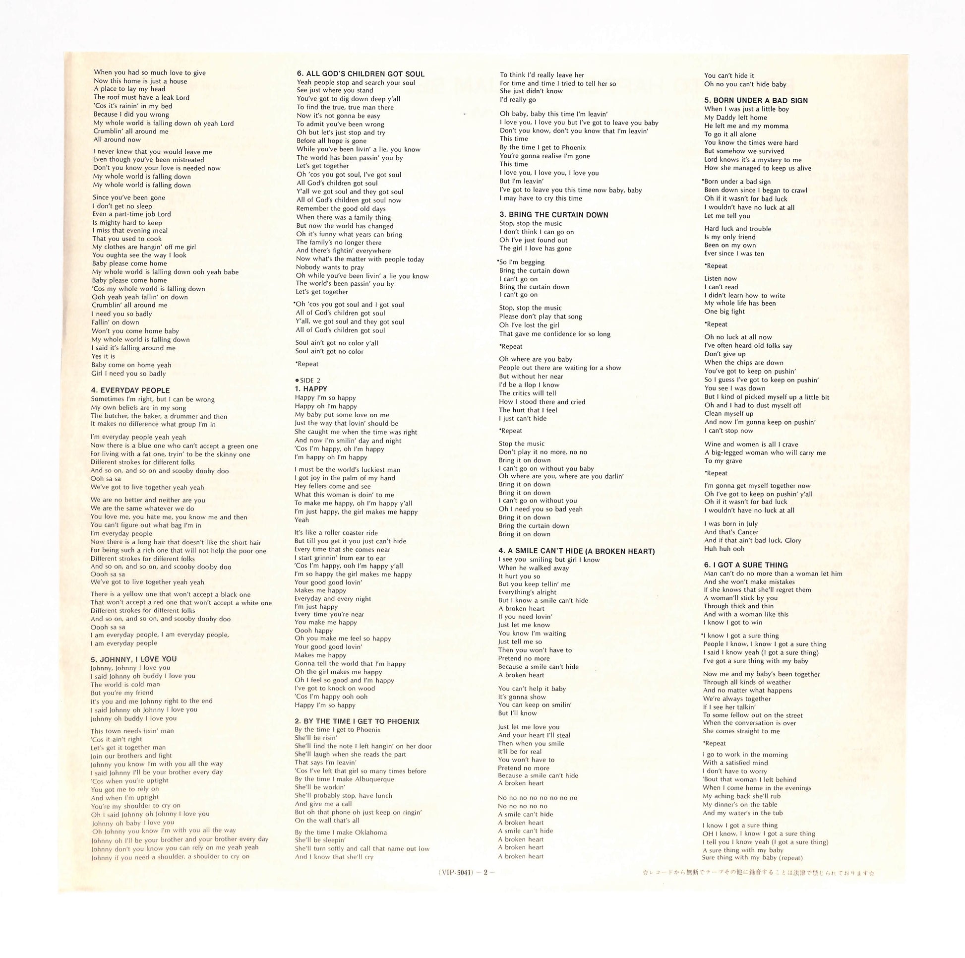良品~並品。スレ、キズ、シミ、シワ、折れ、破れ、書込み、シール貼り(or 貼り跡)、テープ補修等、目立つ劣化や欠陥が認められる状態。程度に応じてVG+/VG/VG-の3段階に分けています。