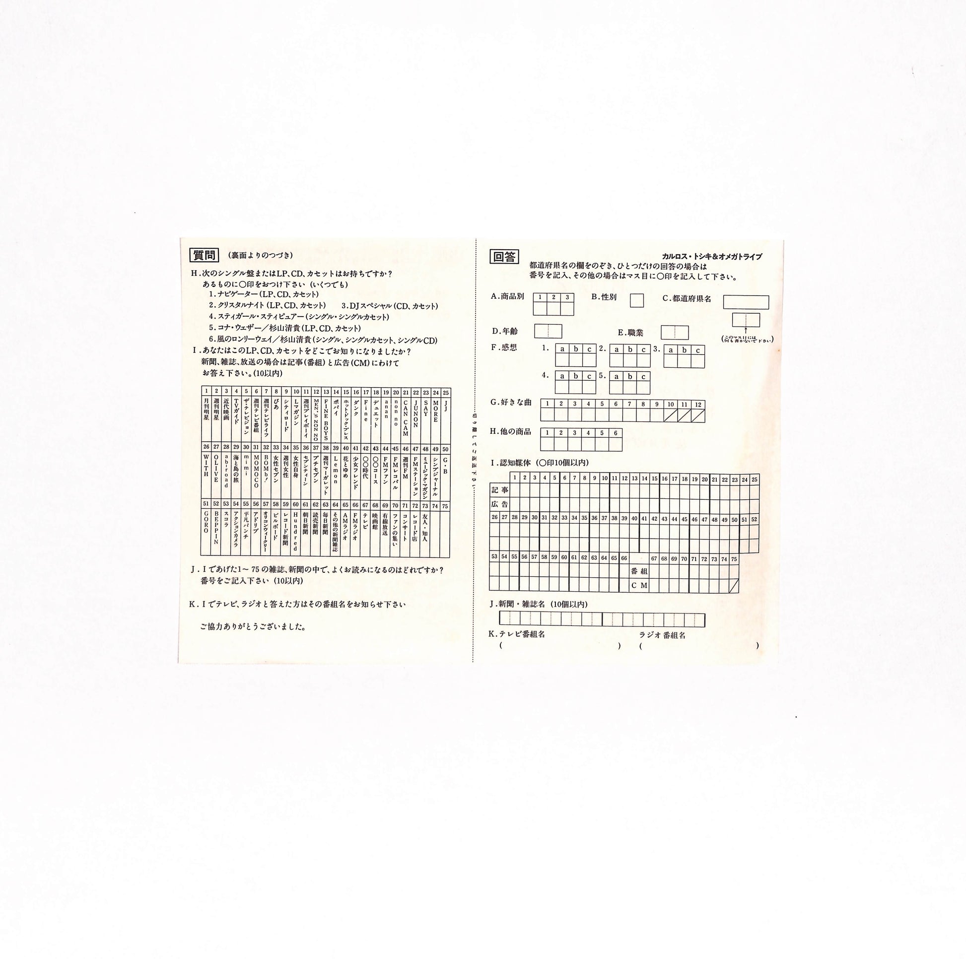 良品~並品。スレ、キズ、シミ、シワ、折れ、破れ、書込み、シール貼り(or 貼り跡)、テープ補修等、目立つ劣化や欠陥が認められる状態。程度に応じてVG+/VG/VG-の3段階に分けています。
