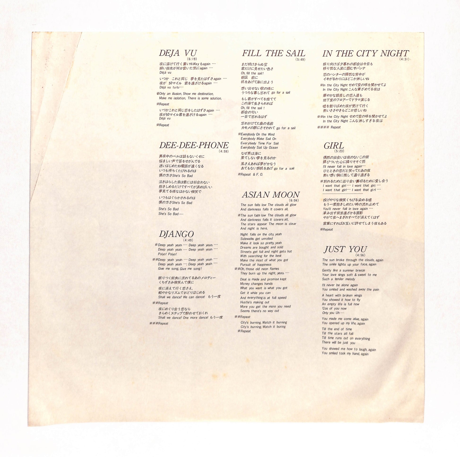 良品~並品。スレ、キズ、シミ、シワ、折れ、破れ、書込み、シール貼り(or 貼り跡)、テープ補修等、目立つ劣化や欠陥が認められる状態。程度に応じてVG+/VG/VG-の3段階に分けています。
