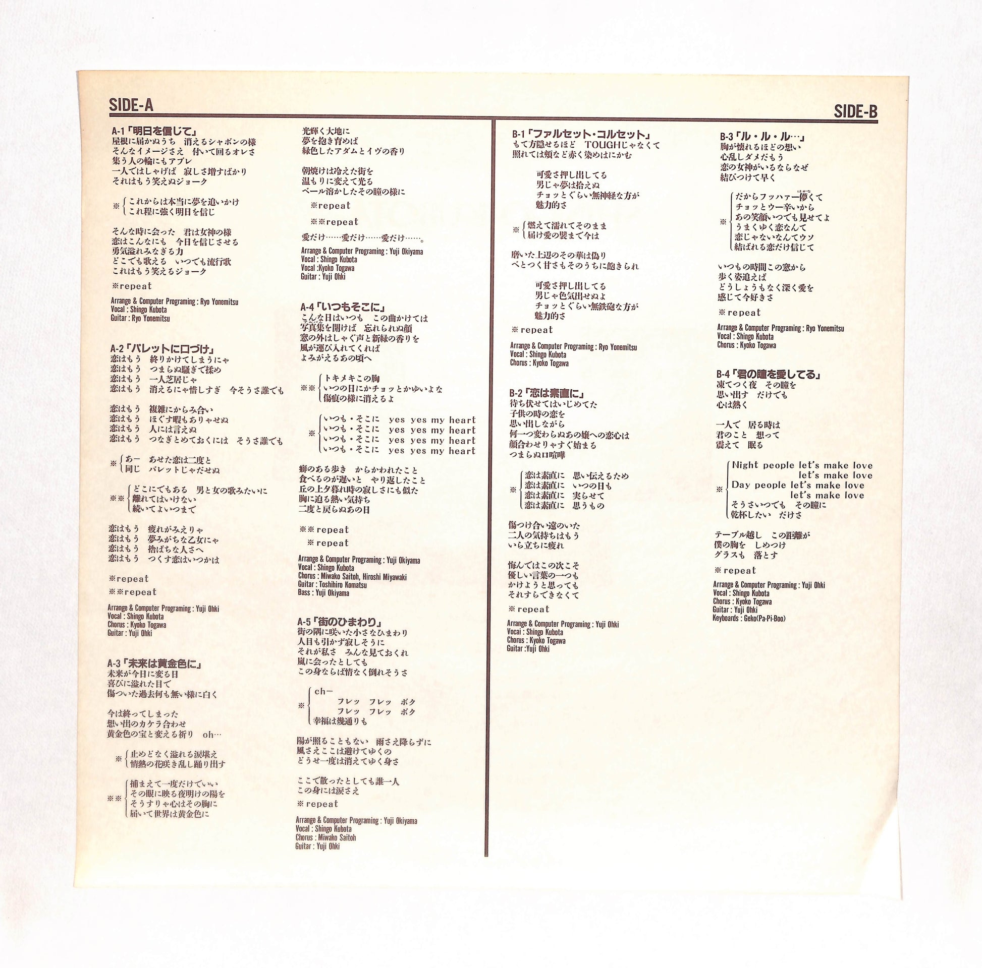 良品~並品。スレ、キズ、シミ、シワ、折れ、破れ、書込み、シール貼り(or 貼り跡)、テープ補修等、目立つ劣化や欠陥が認められる状態。程度に応じてVG+/VG/VG-の3段階に分けています。